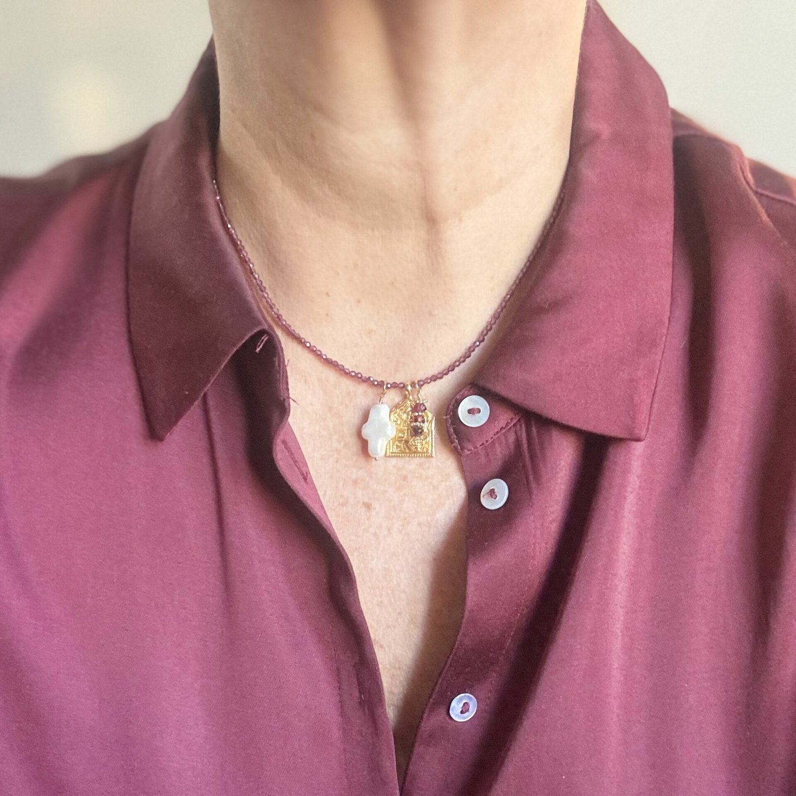 Collier en Grenat, avec une croix en Nacre et un pendentif en Vermeil représentant Shiva, est une pièce chargée de symboles à la fois spirituels et esthétiques.